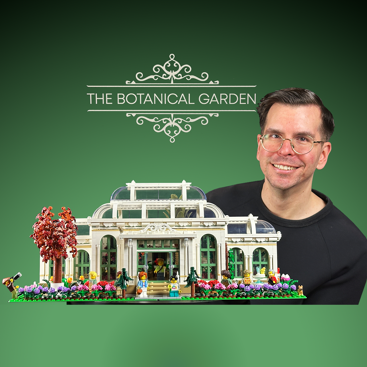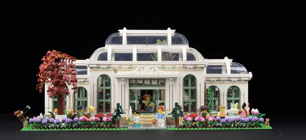 The Botanical Garden set is built on two 32×32 green baseplates, making it one of the largest modular sets by footprint (51 by 25 cm). The garden design takes cues from Victorian-style greenhouses, emphasizing symmetry. The main entrance is flanked by colorful flower beds, blooming trees, and a small sidewalk with a charming fountain and Acer palmatum, adding a scenic touch.
