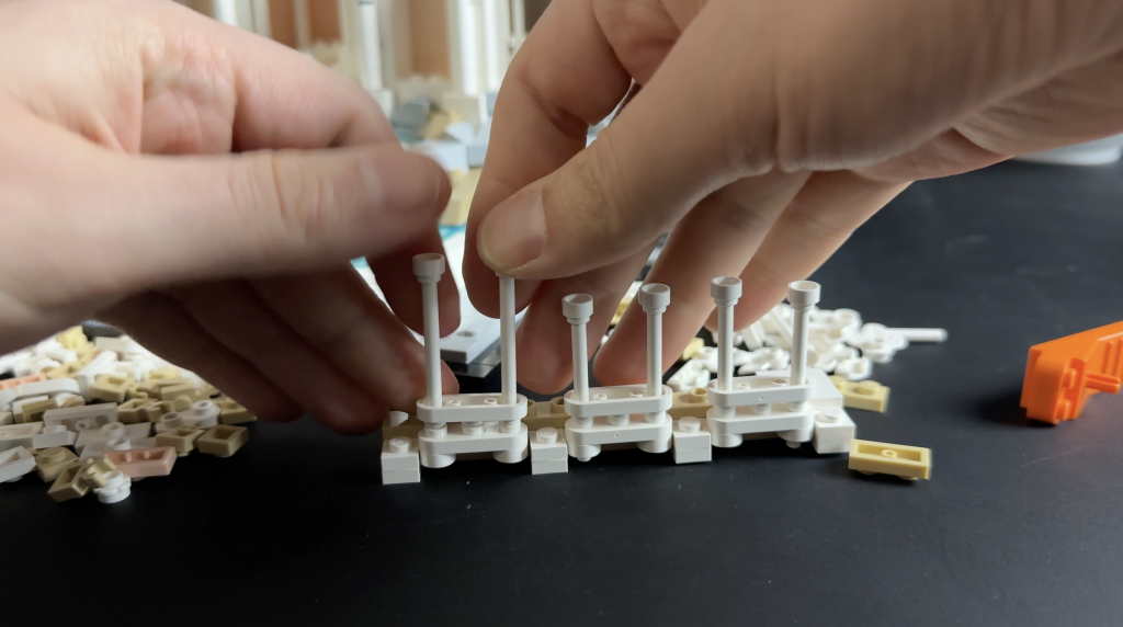 At the tops of the Corinthian columns, LEGO uses leaf elements to represent the capitals. While a creative attempt, this doesn’t perfectly capture the look of traditional Corinthian capitals.