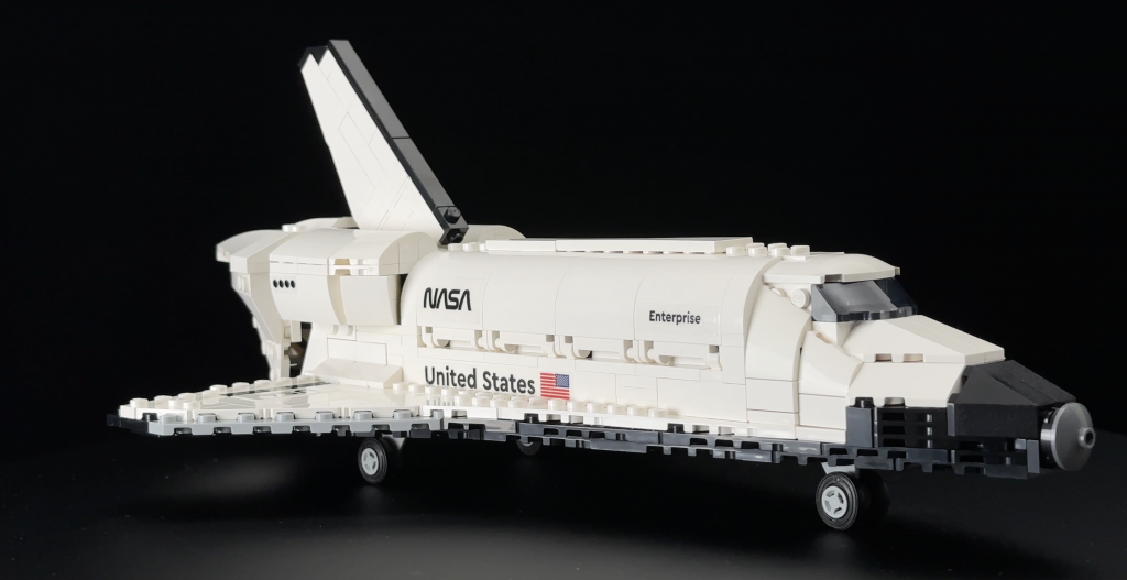 The build features two separate models: the Space Shuttle and the Boeing 747. Starting with the smaller of the two, the Space Shuttle Enterprise is a relatively simple construction. It captures the essential look and proportions, but the design—particularly the nose—feels rough and fragmented. The front uses a collection of mismatched slopes that don’t achieve a smooth finish, which is noticeable on a set aimed at adult collectors.