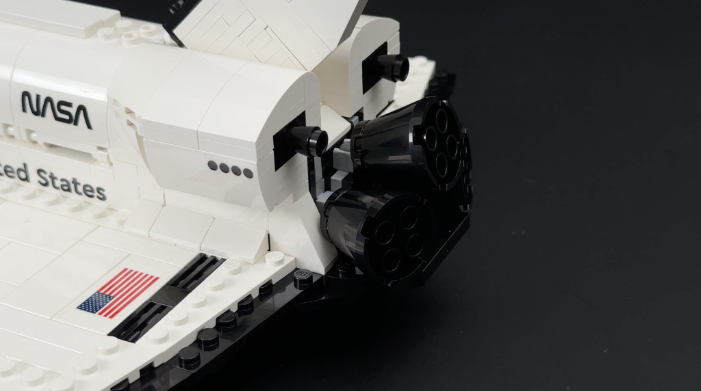 The rear engines are connected by ball joints, allowing for some movement and realism, while the angled rudder uses a bar-and-clip design that adds visual interest. Once the shuttle is converted for transport, its landing gear and engines are removed and placed inside the bay. A tail cone is then added to cover the engine openings, just as NASA did with the real shuttle during transport. Though clever in concept, the tail cone feels a bit bulky and could benefit from a cleaner design.