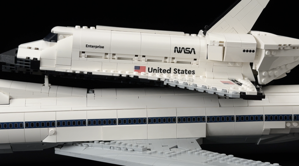 Mounting the shuttle on top of the Boeing 747 is a satisfying process. Once the engines and landing gear are removed, and the tail cone is in place, the shuttle clicks into the struts with a secure fit. Seeing both models combined is a powerful visual moment that elevates the display value of the entire set.
